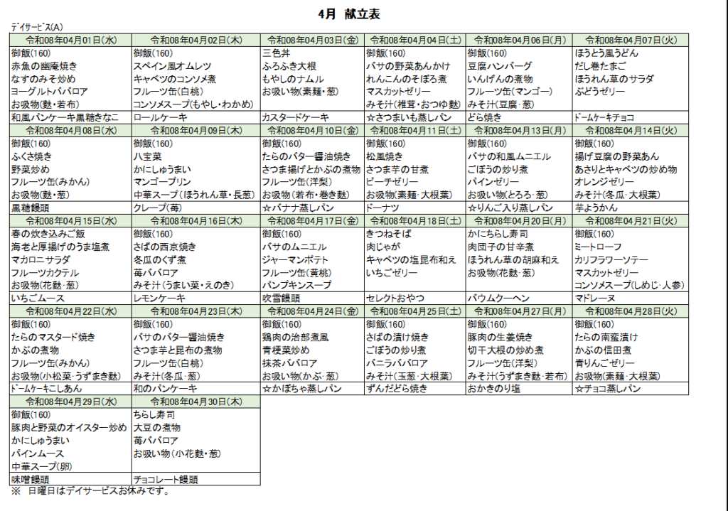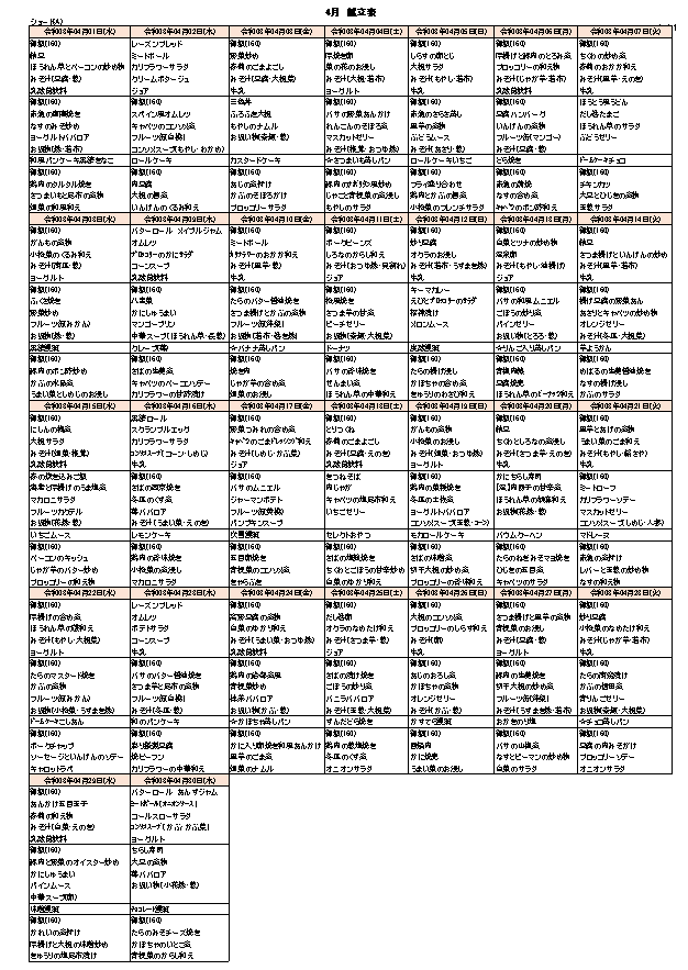 4月の献立表です。