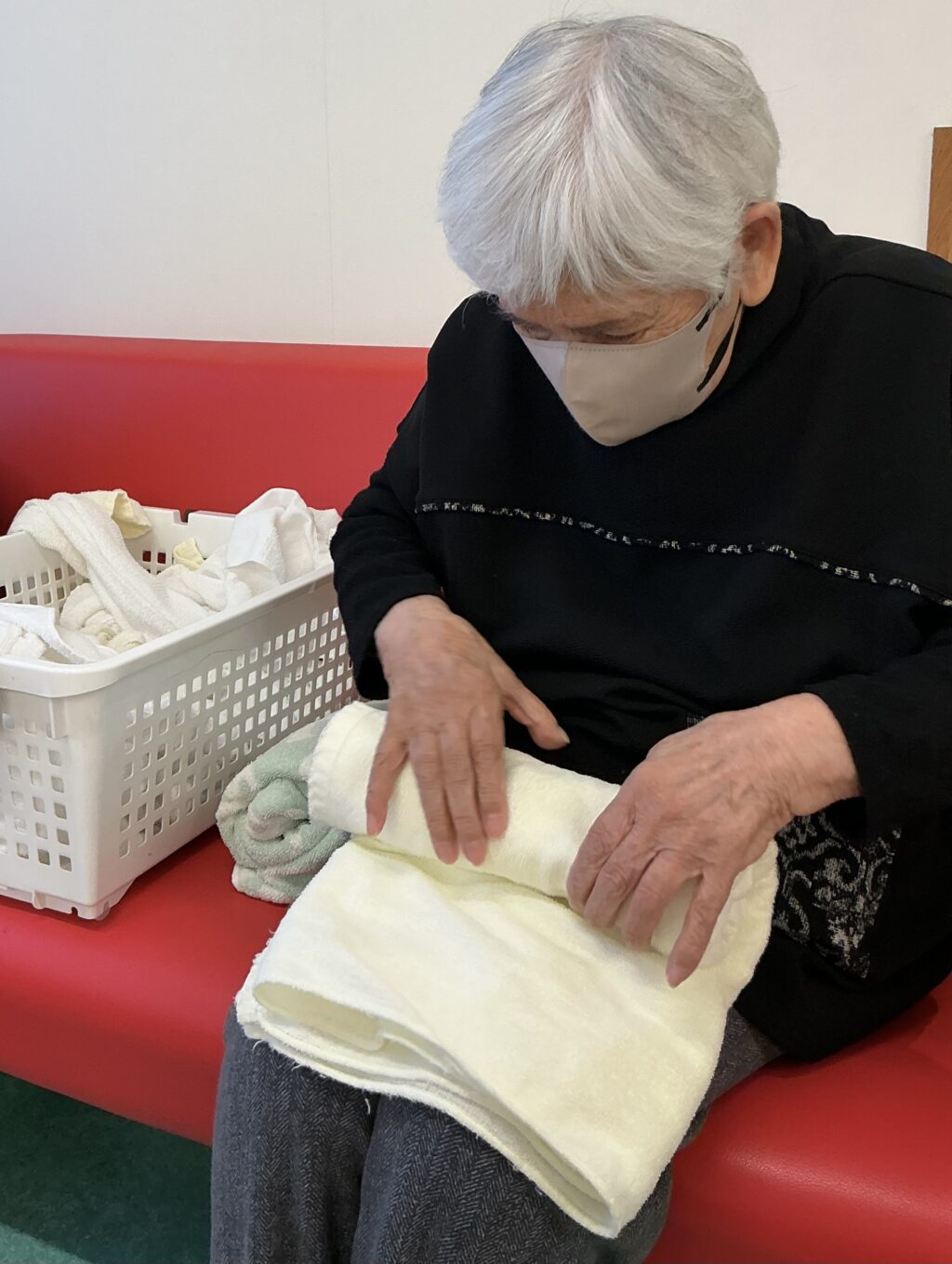 今回ご紹介の写真はご利用者様が洗濯物を畳んでいる様子です🎵