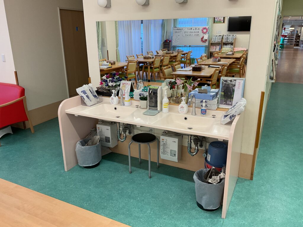 こちらの洗面台は少し低めに設置してあり、背の低い方や車椅子のにも使いやすい仕様となっています。