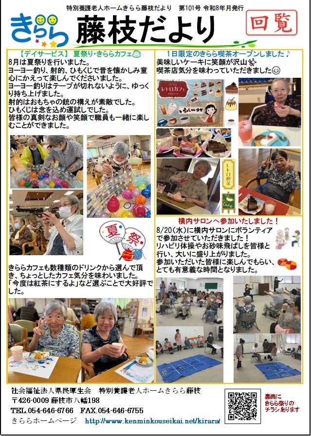 藤枝2025.08.28 【きらら藤枝だより】8月号が出来ました! きららだより8月号が出来ました。 特養やデイサービスで「きららカフェ」を行いましたのでその様子や、「夏祭り」の様子を掲載しております。 他にも地域サロンにて横内サロンへ参加させて頂きましたので、その様子も掲載いたしました。 また裏面には、先日ホームページでもお知らせさせて頂いた「きらら祭り」のチラシを載せさせて頂きました。 ぜひ、ご覧ください。 【令和7年8月号 第101号きららだより】 お便りを押すとPDFが開きます。
