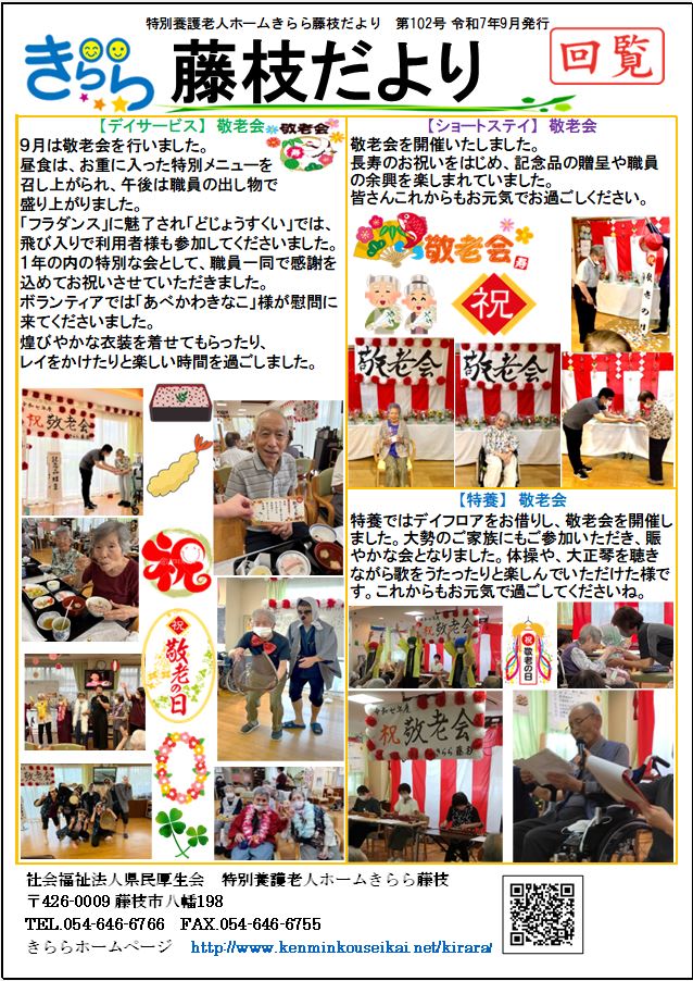 藤枝2025.09.28 【きらら藤枝だより】9月号が出来ました 9月のきららだよりが出来ました。 今回は、敬老会特集です。 慰問のボランティア様による歌や演奏、職員による催し物で楽しく充実した時間を過ごしていただきました。 昼食には豪華なお祝い御膳が提供され、とても美味しそうに召し上がられていました。 職員も一緒に、楽しい時間を過ごさせていただきました。 ぜひご覧ください。 【令和7年9月号 第102号きららだより】